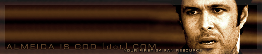 Welcome to the new and improved AlmeidaIsGod.com, your first 24 fan resource and still the greatest Tony Almeida fansite on the net. The purpose of this site, in general, is to offer 24 fan appreciation content that goes above and beyond the standard character guides and episode summaries, elevating 24 fandom to entirely new levels of obsession. The purpose of this site, specifically, is to offer Tony Almeida fans from around the globe one single on-line destination to satisfy their every Tony craving. To sum it up, this is a comprehensive 24 fansite with a Tony-centric approach.